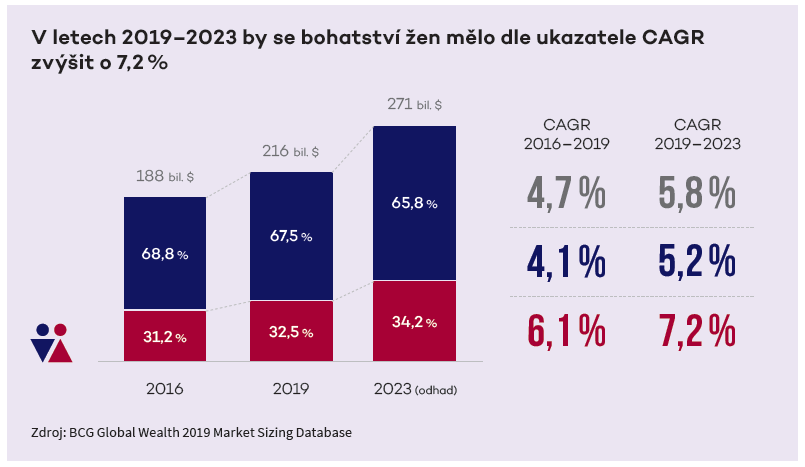 Podle studie společnosti Boston Consulting Group v posledních letech globálně roste majetek žen rekordním tempem – ročně narůstá celosvětově o 5 bilionů dolarů. Mezi lety 2016 a 2019 dokonce rostl majetek žen rychleji než ten mužský, konkrétně o 6,1 procenta, zatímco u mužů to bylo o 4,1 procenta.