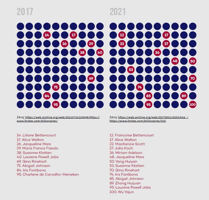 Stále rostoucí ekonomický vliv ženské populace je čitelný i z žebříčků nejbohatších lidí na světě. V seznamu světových dolarových miliardářů, který sestavuje každoročně americký časopis Forbes, při porovnání let 2017 a 2021 stoupl počet movitých žen z 10 na 14 a hodnota jejich majetku byla více než dvojnásobná.