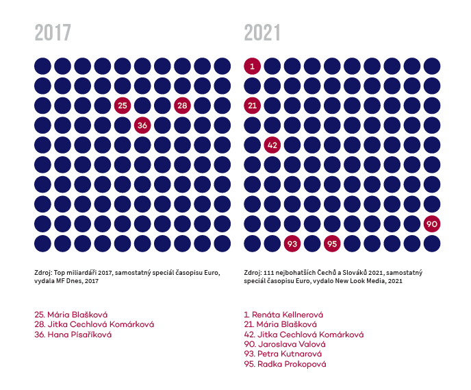 Například v žebříčku miliardářů sestavovaném časopisem Euro se v roce 2021 počet žen v první stovce nejbohatších lidí v Česku v porovnání s rokem 2017 zdvojnásobil.