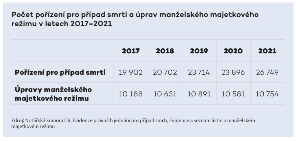 Zdá se, že tento statistický fakt si lidé začínají stále více uvědomovat. Podle údajů Notářské komory České republiky totiž počet závětí posledních pět let postupně stoupá.