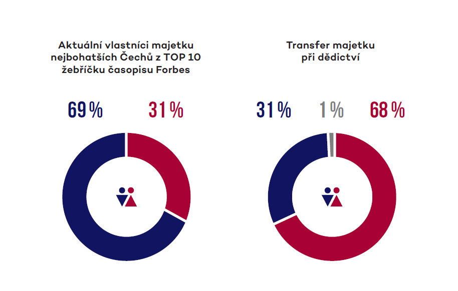 Žebříček nejbohatších Čechů podle magazínu Forbes Česko totiž vede Renáta Kellnerová, která se po tragickém úmrtí svého manžela Petra Kellnera, zakladatele investiční skupiny PPF, stala správkyní jeho pozůstalosti. V rozložení majetku mezi muže a ženy proto není u žebříčku deseti nejbohatších Čechů tak vysoký nepoměr, jako je tomu u rodinných firem. I tak nicméně mužům stále připadá většina majetku (69 %), zatímco ženy nyní spravují zhruba jeho třetinu (31 %).