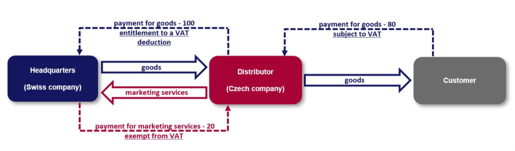 At the same time, the Distributor was receiving payments for marketing services from the Headquarters, which ensured that the Distributor was profitable from the perspective of transfer prices, despite selling the medicinal products at a loss. The Distributor reported the marketing services as a provision of services with the place of supply outside of the Czech Republic; therefore, the income from such supply was exempt from VAT in the Czech Republic (with the entitlement to a tax deduction).