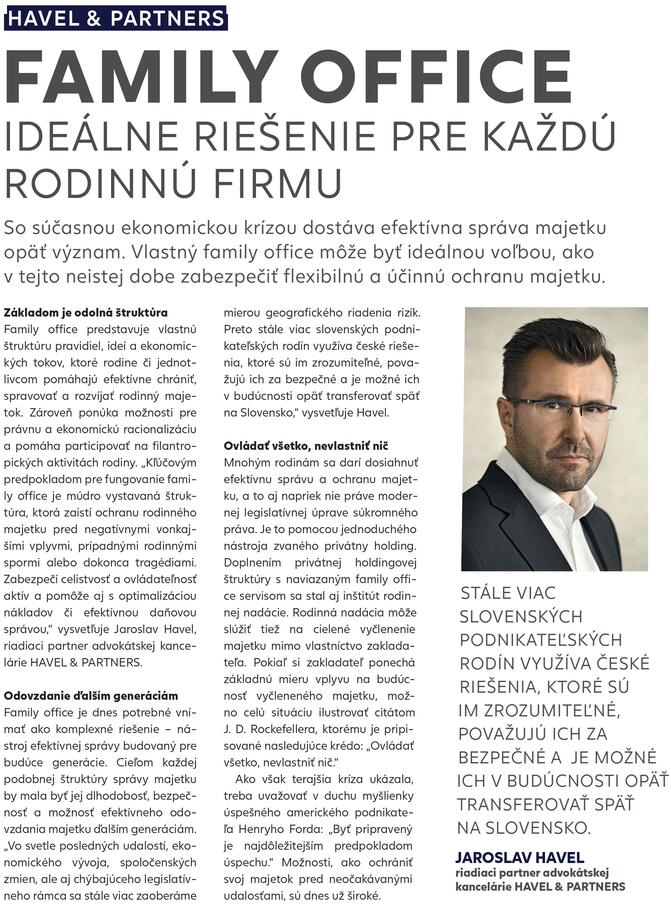 Family office predstavuje vlastnú štruktúru pravidiel, ideí a ekonomických tokov, ktoré rodine či jednotlivcom pomáhajú efektívne chrániť, spravovať a rozvíjať rodinný majetok. Zároveň ponúka možnosti pre právnu a ekonomickú racionalizáciu a pomáha participovať na filantropických aktivitách rodiny. „Kľúčovým predpokladom pre fungovanie family office je múdro vystavaná štruktúra, ktorá zaistí ochranu rodinného majetku pred negatívnymi vonkajšími vplyvmi, prípadnými rodinnými spormi alebo dokonca tragédiami. Zabezpečí celistvosť a ovládateľnosť aktív a pomôže aj s optimalizáciou nákladov či efektívnou daňovou správou,“ vysvetľuje Jaroslav Havel, riadiaci partner advokátskej kancelárie HAVEL & PARTNERS.