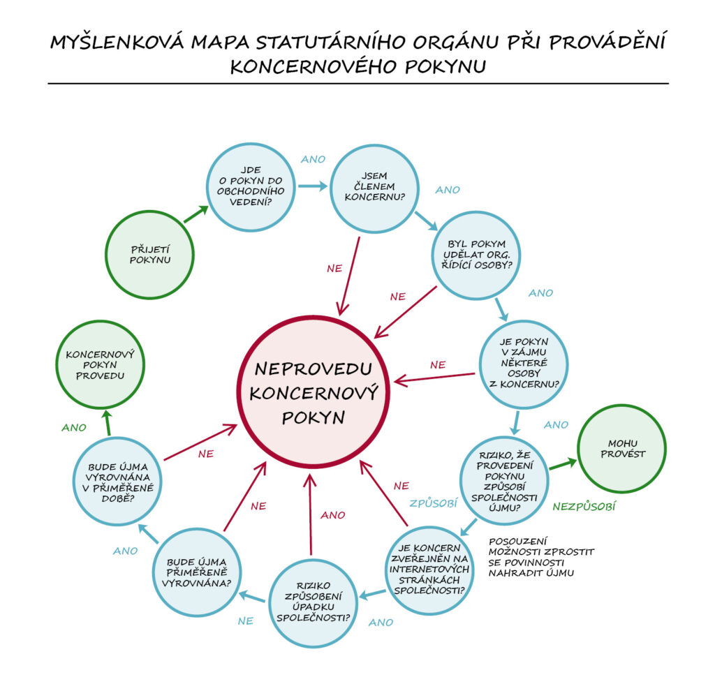 V tomto ohledu tak lze poskytnout jednoduchý postup statutárního orgánu při přijetí koncernového pokynu a posouzení, zdali takový pokyn může být proveden, či nikoliv. Jednotlivé kroky na sebe navazují, platí však, že při každém kroku musí být daná podmínka posouzena s péčí řádného hospodáře (zároveň upozorňujeme, že každá situace může být individuálně odlišná, a nelze tak považovat níže uvedený nákres za univerzální řešení všech takových situací).